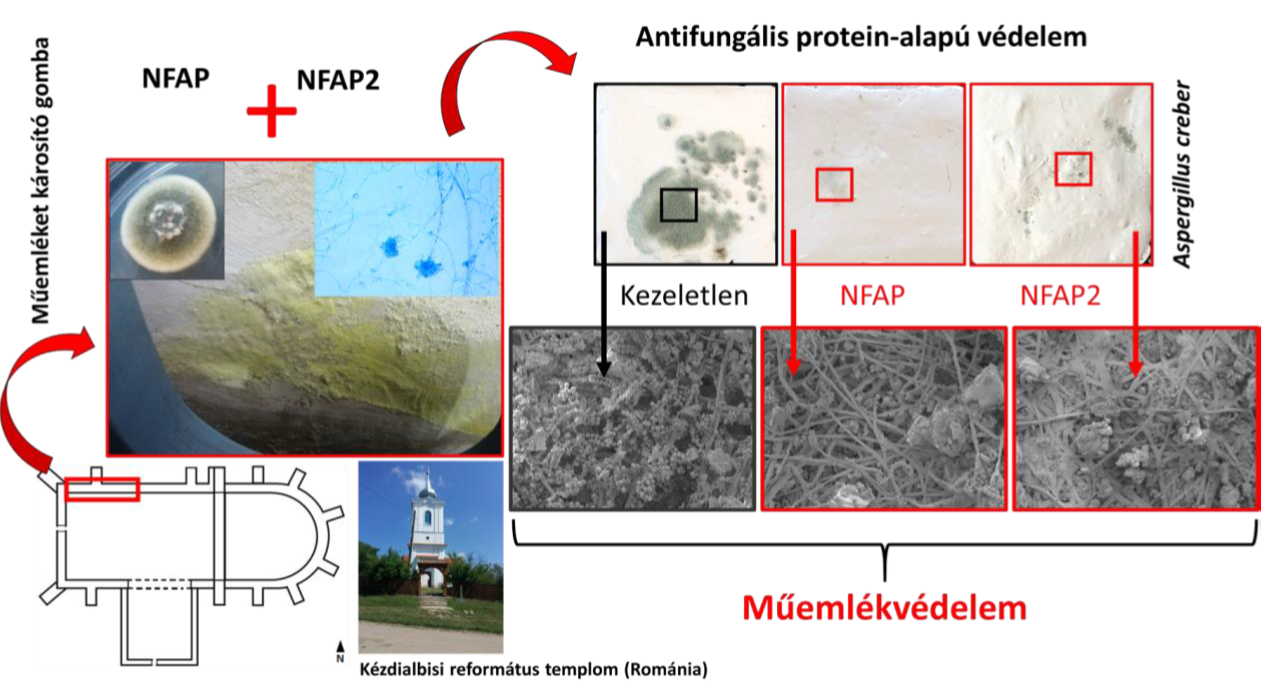 Összesen 11 különböző gombafajt izoláltunk a templom belső falairól, köztük két, eddig még nem leírt Cladosporium fajt. Emellett elsőként mutattuk ki a Pseudopithomyces chartarum (fitopatogén) és a Beauveria pseudobassiana (entomopatogén) jelenlétét egy épület belső falán, mint műemlék károsító biodeteriogén fajokat. Az antifungális érzékenységi vizsgálatok eredményei alapján az NFAP és NFAP2 eltérő spektrummal és hatékonysággal gátolta a leggyakrabban előforduló beltéri gombák növekedését. A falmodellen végzett kísérletek során megfigyeltük, hogy az NFAP és NFAP2 jelentősen csökkentette az Aspergillus creber kolonizációs képességét. A pásztázó elektonmikroszkópiás vizsgálatok megerősítették, hogy mindkét fehérje gátolja a gomba növekedését és konídiumképzését. Megfigyeltük, hogy a védelmi céllal előzetesen felvitt fehérjék akár hónapokig is megőrzik a hatékonyságukat beltéri körülmények között, azonban az erős UV-besugárzás csökkenti azt.